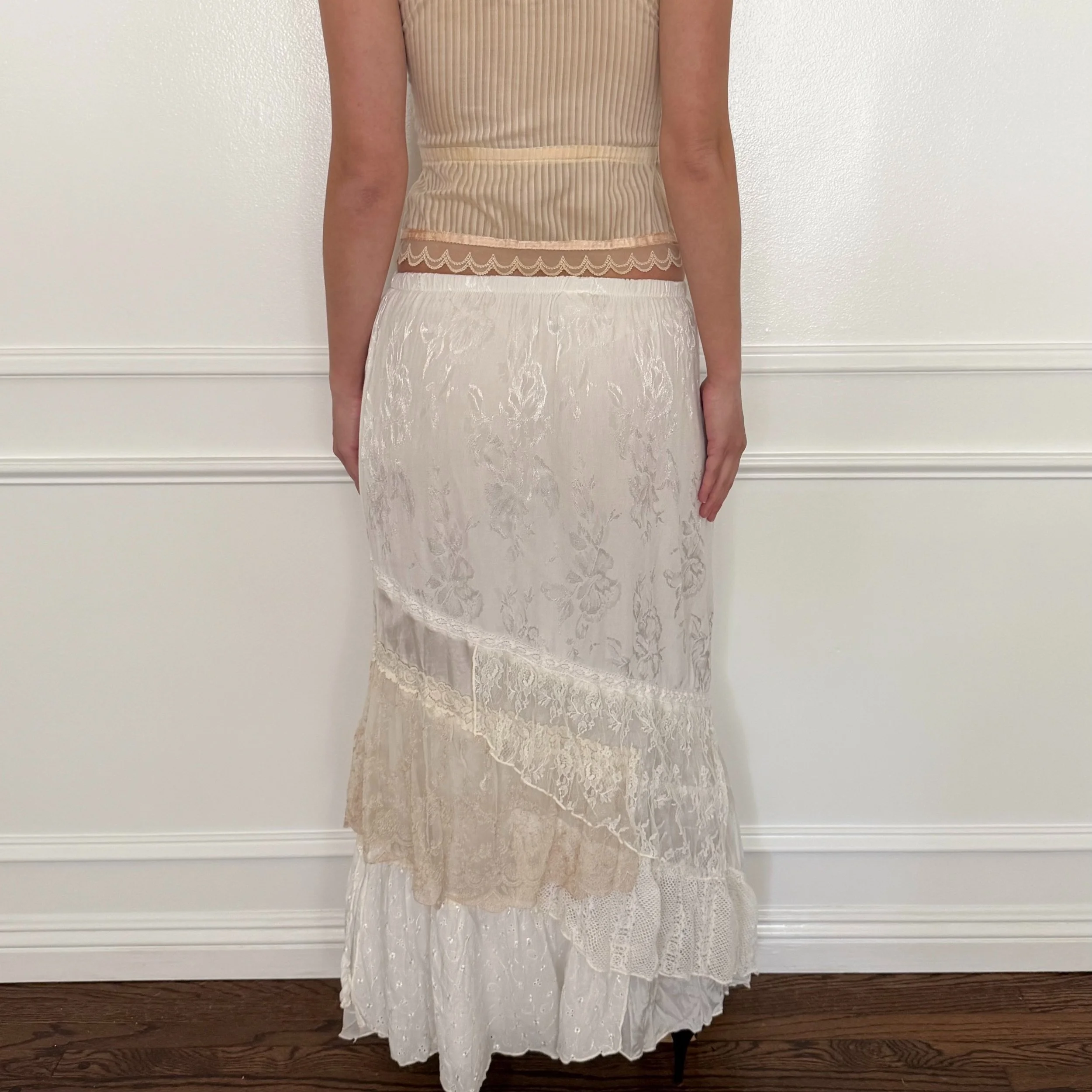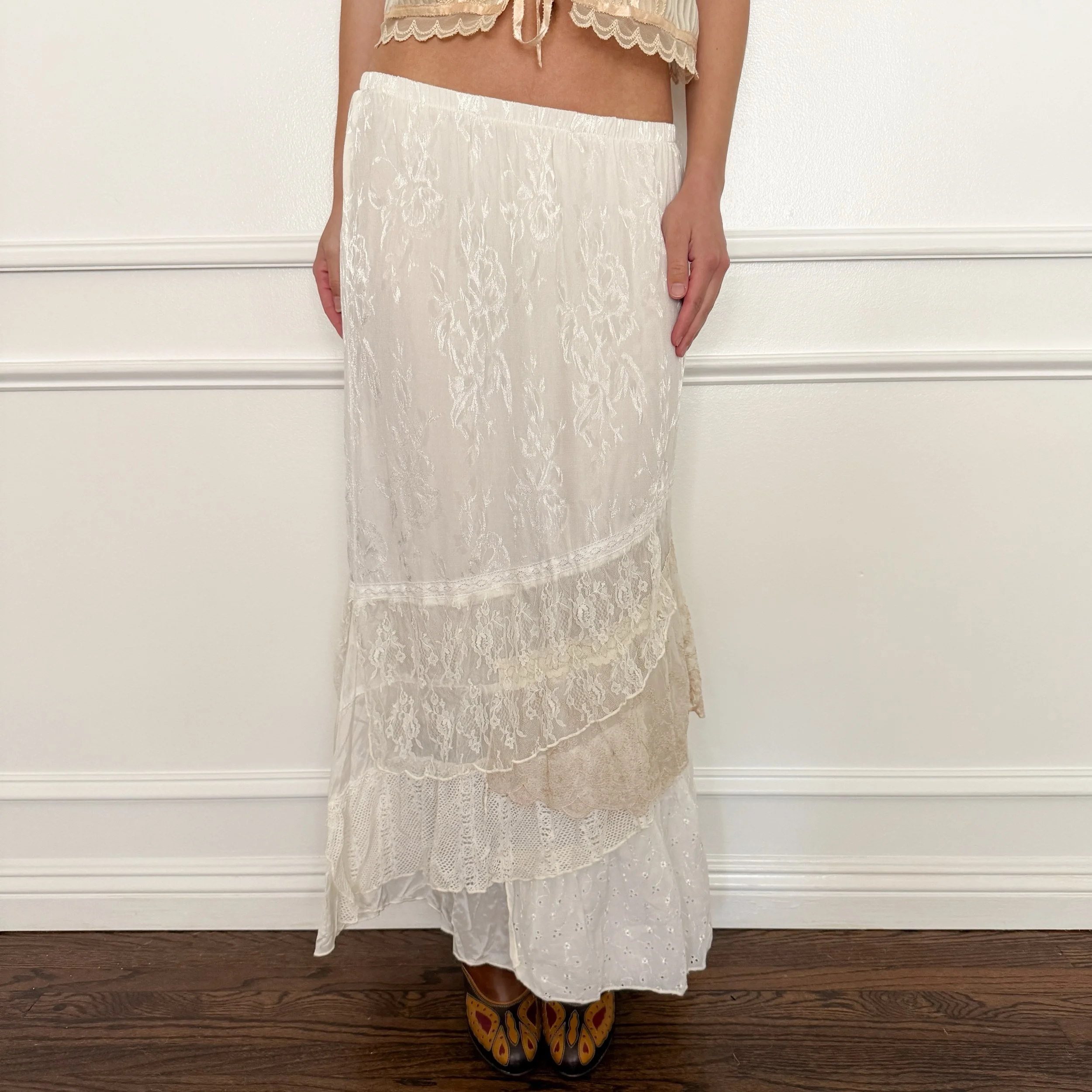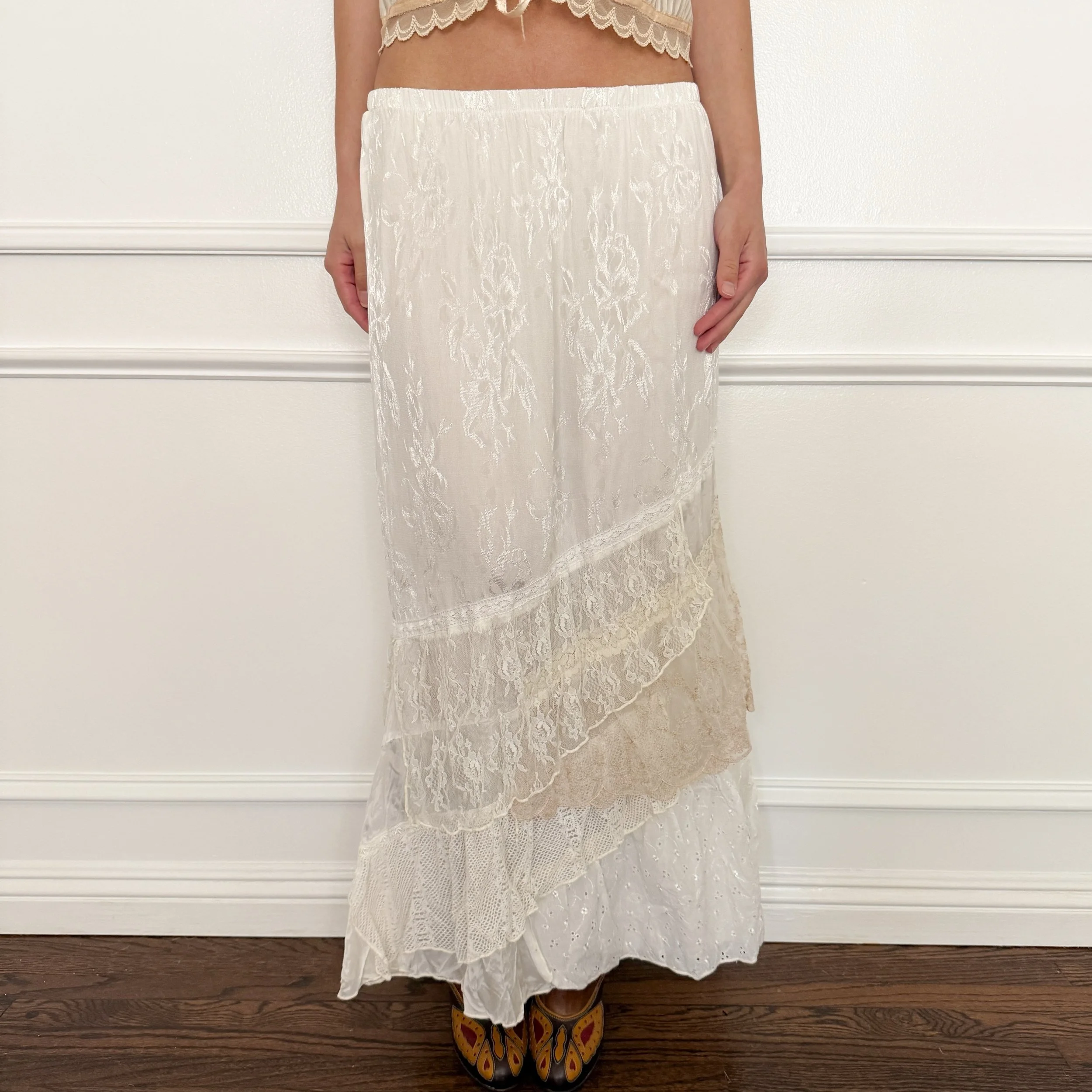 Romantic Vintage White Floral Lace Accented Prairie Skirt (M-L)