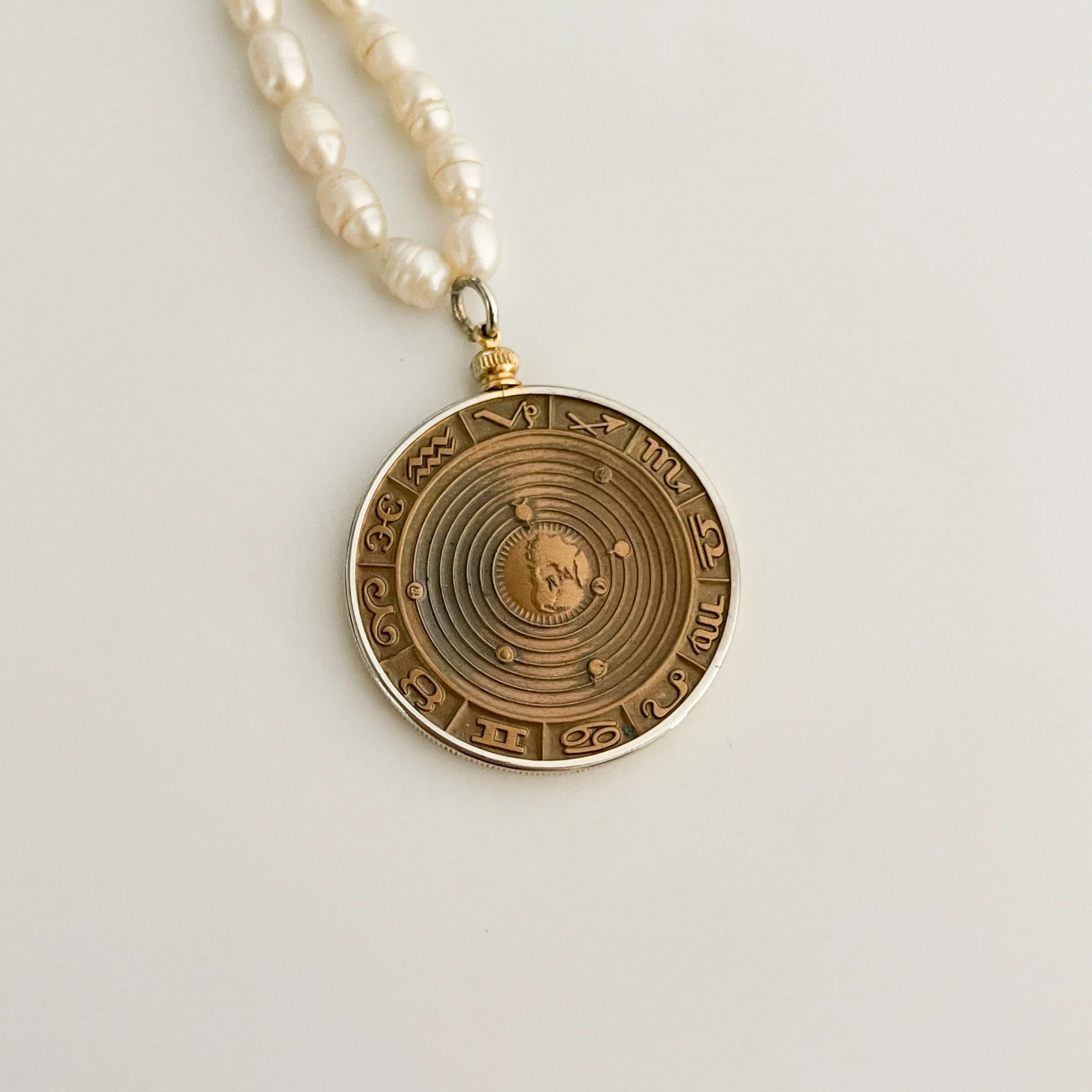 The pendant on this necklace is an authentic vintage zodiac medallion pendant circa the 1970’s. This necklace is double-sided and can be worn two ways. One side features the twins, representing the sign Gemini, born between May 22 and June 21—these dates, the word “GEMINI”, and mini depictions of the sign’s astrological symbol, are also all part of the design. The other side of the pendant features the symbols of all twelve zodiac signs, surrounding a blazing sun and miniature representations of astrological planet symbols. A personal and rare vintage necklace to treasure forever.